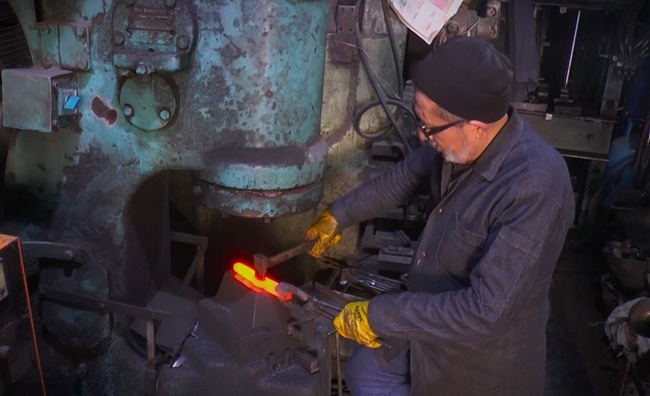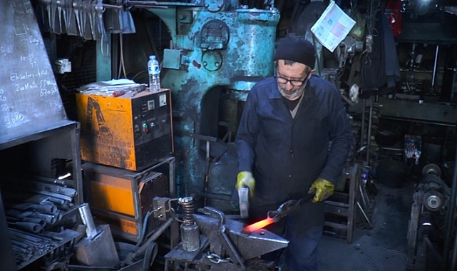 Sıcak demiri örs üzerinde döverek tarım aletleri üretiyor
