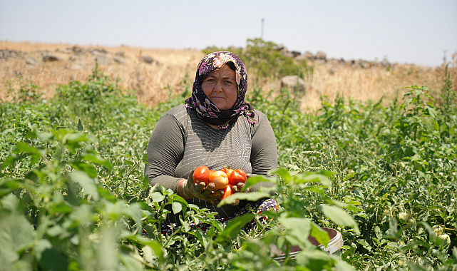 Kilis'te hasadına başlanan domates verimiyle yüz güldürürken kavurucu sıcağın altında tarlada domates hasadı yapan tarım işçilerinin de zorlu mesaisi başladı.